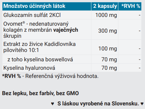 Obsahuje dôležité zložky ako glukozamín, kolagén z membrán vaječných škrupín (Ovomet®), Boswellia serrata a kyselinu hyalurónovú, ktoré sú známe svojimi protizápalovými a regeneračnými účinkami.