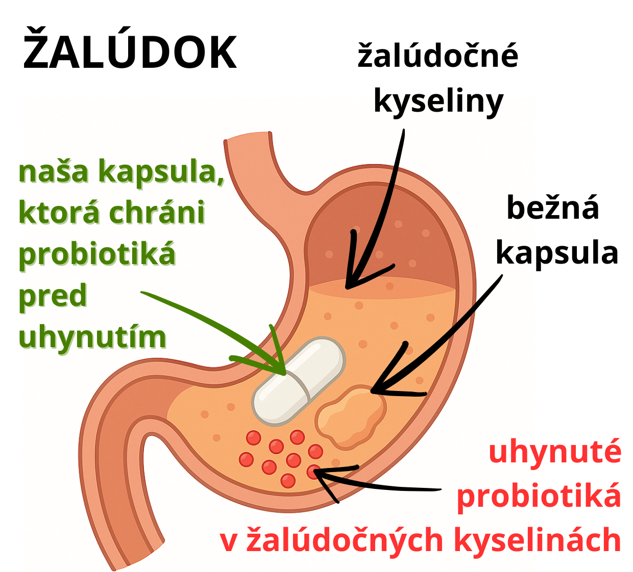 Gastrorezistentné kapsula (špeciálna kapsula, ktorá sa nerozpustí v žalúdku, ale v čreve, a ochráni tak probiotické baktérie pred uhynutím) – zabezpečí tak, že probiotiká sa dostanú živé presne tam kde majú: do čriev.